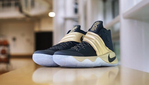 Pour cette rencontre, Kyrie Irving a joué avec une version noir/or de sa Kyrie 2. Le métal précieux est évoqué sur la sangle, la semelle, et avec des petites poussières sous le pied.