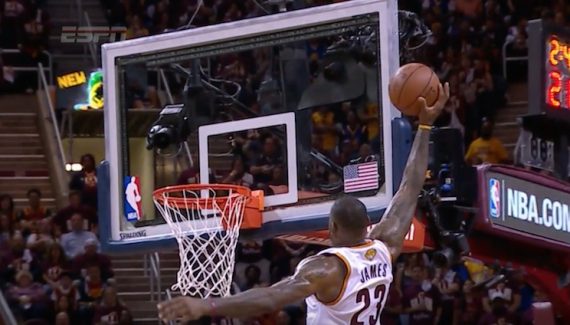 Kyrie Irving réalise un grand numéro face à Stephen Curry, mais la première place revient logiquement à LeBron James pour son alley oop en deuxième mi-temps. Il intercepte la balle, se retrouve à quatre pattes, se relève, et alors que la passe est moyenne, il va la chercher pour claquer ce dunk !