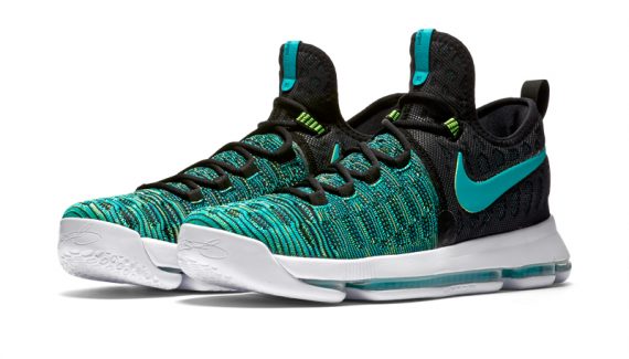 Pendant ce voyage, Nike a dévoilé un nouveau coloris de la KD9, baptisé “Birds of Paradise.” La tige mélange le noir et le vert, avec un rappel de cette couleur sur la bulle de la poche Zoom Air. Le tout est parfaitement souligné par une semelle blanche, et le résultat est très réussi.