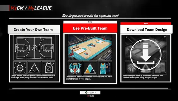 Pour vous aider dans la création d'une nouvelle franchise, NBA 2K17 proposera dix modèles de franchises avec logo, salle, maillots… qu'il sera possible de personnaliser. Pour coller au mieux à la NBA, il y aura une “expansion draft” pour sélectionner des joueurs dans les autres équipes, ainsi qu'une Lottery et une Draft.
