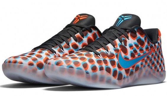 Attention les yeux, voici la… Kobe 11 3D ! Comme son nom l’indique, ce modèle semble apparaître en relief, et la languette s’illumine aussi dans la nuit.