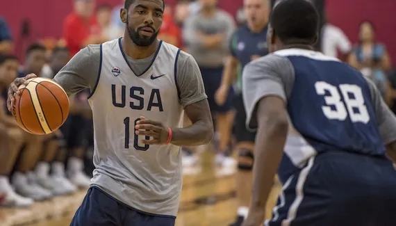 /https%3A%2F%2Fwww.basketusa.com%2Fapp%2Fuploads%2F2016%2F07%2Firving-teamusa-practice.jpg) Avec deux terrains, les 36 joueurs de Team USA et de la Select Team sont répartis par atelier, et voici des images d'un exercice de un-contre-un sur quart de terrain. La consigne est simple : l'attaquant a le droit à deux dribbles maximum.