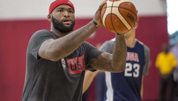 Pour s’échauffer, les joueurs de Team USA font comme nous tous : beaucoup de shoots, et des jeux quand la motivation y est. Ici, Klay Thompson, DeMarcus Cousins, Paul George, Jimmy Butler et un membre du staff s’affrontent dans ce jeu appelé communément (ou plutôt en fonction des régions de l’hexagone), la tirelire.