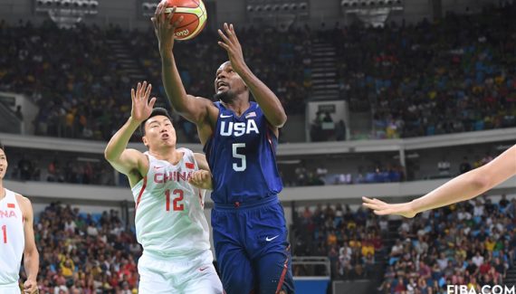 Si les premières minutes du match sont équilibrées, Team USA enclenche l’accélérateur dans le sillage de Kevin Durant, en réussite sur ses quatre premiers tirs, mais aussi Carmelo Anthony à longue distance. Les Chinois résistent comme ils le peuvent, c’est à dire difficilement, mais l’énergie est là. Cette combativité se paye par une pluie de fautes, notamment de Zou Yuchen et Zhou Qi. Team USA ne s’arrache pas, il y a un brin de maladresse et de décontraction mais l’écart est naturellement là : 30-10 après dix minutes.