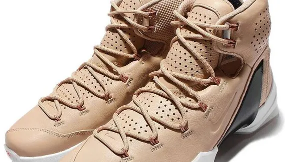 La gamme de la ligne LeBron chez Nike s'étend encore avec une version Elite très surprenante de la LeBron 13. En cuir marron clair type “Tan Vachetta”, en partie perforée sur la tige et la languette, accompagnée de finitions soignées à l'image des oeillets métalliques, cette LeBron 13 Elite LB EP présente un visage massif et acéré, non sans rappeler la gueule d'un squale.