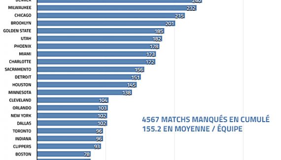 Ce n’est pas non plus anodin de constater que 11 des équipes les plus touchées par les blessures l’an passé faisaient partie des 15 plus mauvais taux de remplissage de salle de la ligue : New Orleans, Memphis, Washington, Philadelphie, Denver, Milwaukee, Brooklyn, Utah, Phoenix, Charlotte et Detroit. Le facteur blessure n’est sans doute pas la seule explication mais il est clair qu’à l’heure où les fans ont le choix entre une multitude de divertissements, il est difficile de les inciter à débourser une somme conséquente pour un ticket d’entrée au match sans la garantie de voir les joueurs espérés.