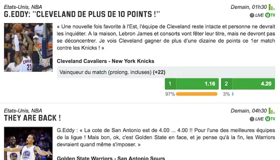 C'est le grand retour des conseils pour parier avec George Eddy, le Monsieur Money Time d'Unibet. Pour cette première soirée, il mise sur les Cavaliers et les Warriors.