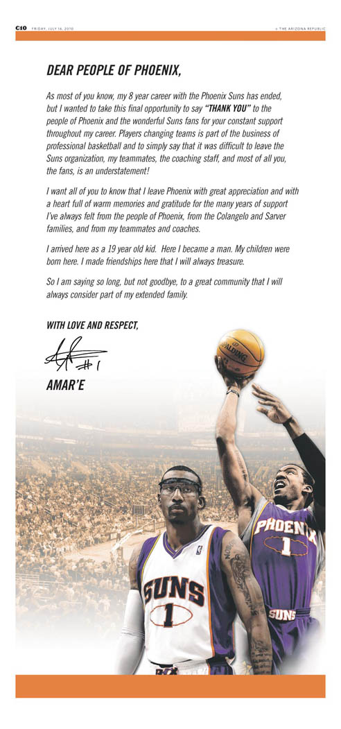 Parti à New York il y a 10 jours, Amare Stoudemire n’est pas du genre à tourner le dos à son passé. Ce week-end, il s’est offert une pleine page de pub’ dans l’Arizona Republic.