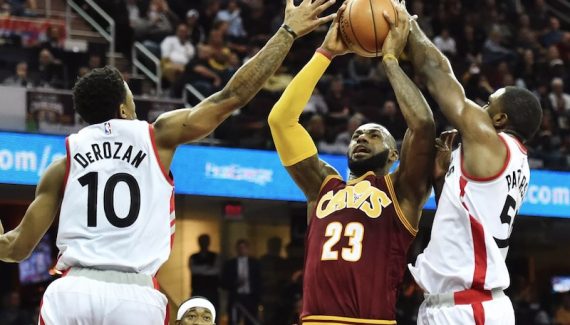 Toronto démarre fort avec Powell (remplaçant dans le 5 majeur de Carroll, touché au genou), puis DeRozan qui confirme tout son talent à mi-distance. Pour rester dans le coup, Cleveland s’en remet à King James et à l’opportuniste Irving, présent à deux reprises au rebond offensif (15-17). Richard Jefferson, titularisé à la place de JR Smith (cheville) remet les deux équipes à égalité d’un dunk en contre-attaque sur un service de LBJ main gauche. Le vent semble tourner lorsque James puis Love avec la planche font à leur tour parler leur adresse à mi-distance, alors que DeRozan rate deux tirs de suite. Mike Dunleavy Jr à 3 points et Tristan Thompson au dunk permettent aux locaux de prendre 7 longueurs d’avance (30-23).