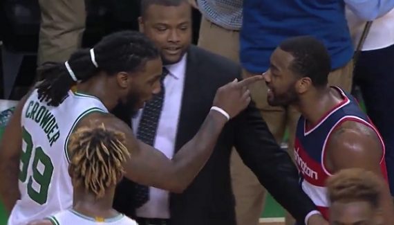 Les deux protagonistes sont John Wall et Jae Crowder. Ça commence par du trash talking, puis Crowder met son doigt sur le nez de Wall, qui réplique immédiatement par une gifle… Leurs coéquipiers et le service d’ordre interviennent illico pour les calmer.