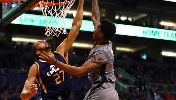 /https%3A%2F%2Fwww.basketusa.com%2Fapp%2Fuploads%2F2017%2F01%2Fgobert-suns.jpg) Comme Joe Johnson a quitté Phoenix avant de devenir un septuple All-Star, les fans des Suns n'ont jamais vraiment eu droit à son meilleur. Lundi soir, l'arrière vétéran avait décidé de leur montrer quelques highlights de son “best of”: avec 10 de ses 15 pts dans le 4e quart-temps dont un tir primé décisif à 49 secondes du terme, Johnson facilite la victoire du Jazz (101-106). Dominateur tout le match, Rudy Gobert (18 pts, 17 rbds) a sorti le contre de la soirée sur Marquese Chriss à -3 et 8 secondes de la fin.