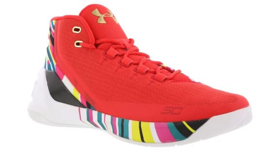 Ce samedi 21 janvier, un coloris spécial de la Curry 3 sera mis en vente. Si la tige est d’un rouge uni très simple, un motif multicolore bariolé vient prendre place sur le talon et la semelle intermédiaire. Quelques touches dorées viennent compléter l’ensemble.
