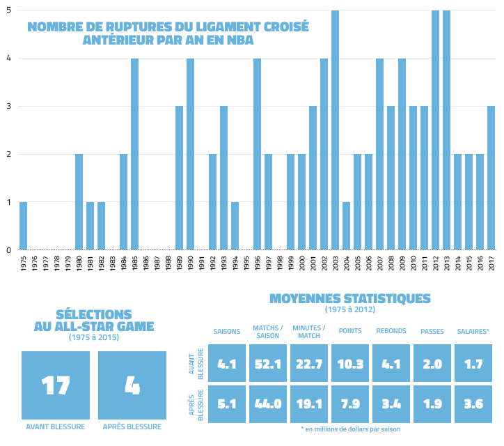 Depuis 1970, ils sont plus de 80 basketteurs à avoir fait la même chose. D’après une étude de plusieurs chirurgiens américains, entre 1975 et 2012, 98% des basketteurs opérés d’une rupture du ligament croisé antérieur sont revenus sur les terrains, après 11.6 mois en moyenne. Certains d’entre eux (Bernard King, Tim Hardaway, Danny Manning, Jamal Crawford, Tony Allen, Kyle Lowry, Baron Davis…) y ont même brillé pendant très longtemps mais l’étude statistique prouve quand même que les performances des joueurs sont globalement affectées par cette blessure.