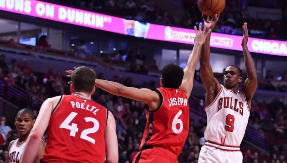 Ce dernier fait très tôt sentir sa présence. Quand il envoie Gibson au alley-oop en contre-attaque, ou quand il coupe une ligne de passe avant d’aller lui-même conclure au dunk. Toronto rétorque grâce à l’adresse de Valanciunas, auteur de plusieurs jumpers. Comme souvent, le pivot est sollicité au début de match, avant d’être petit à petit oublié au fil du match. Un autre homme de raquette se fait rapidement remarquer : Cristiano Felicio. Portis rate son lay-up en contre-attaque : grosse claquette dunk de Felicio (24-18). Rondo rate son tir : claquette dunk encore. Son énergie est contagieuse pour les autres remplaçants des Bulls. Rondo en particulier. Agressif en attaque, il enchaine plusieurs tirs extérieurs, dont l’un après un gentil cross sur Joseph. Lorsque le meneur plante de loin, ça change tout. Déjà 10 points pour lui dans ce quart-temps.
