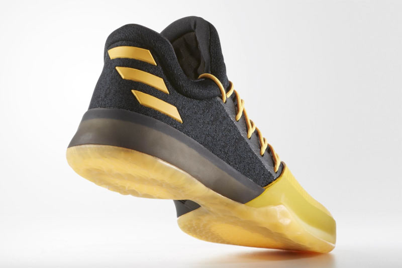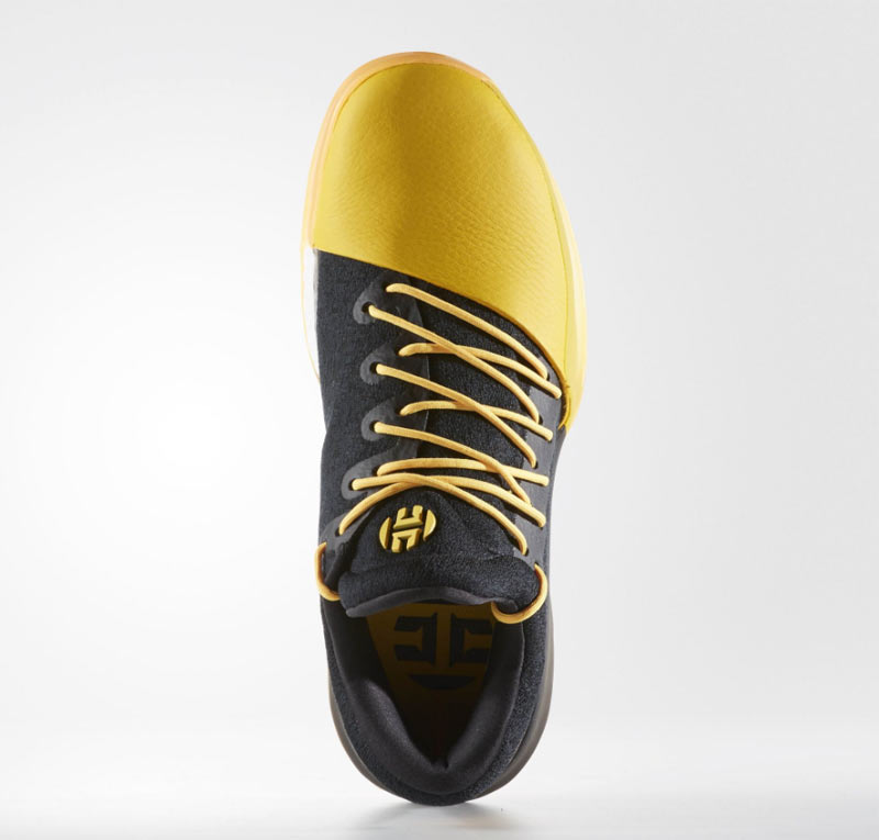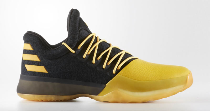 Adidas continue d’exploiter le mélange des matériaux sur la Harden Vol.1 pour proposer des coloris très tranchés.
