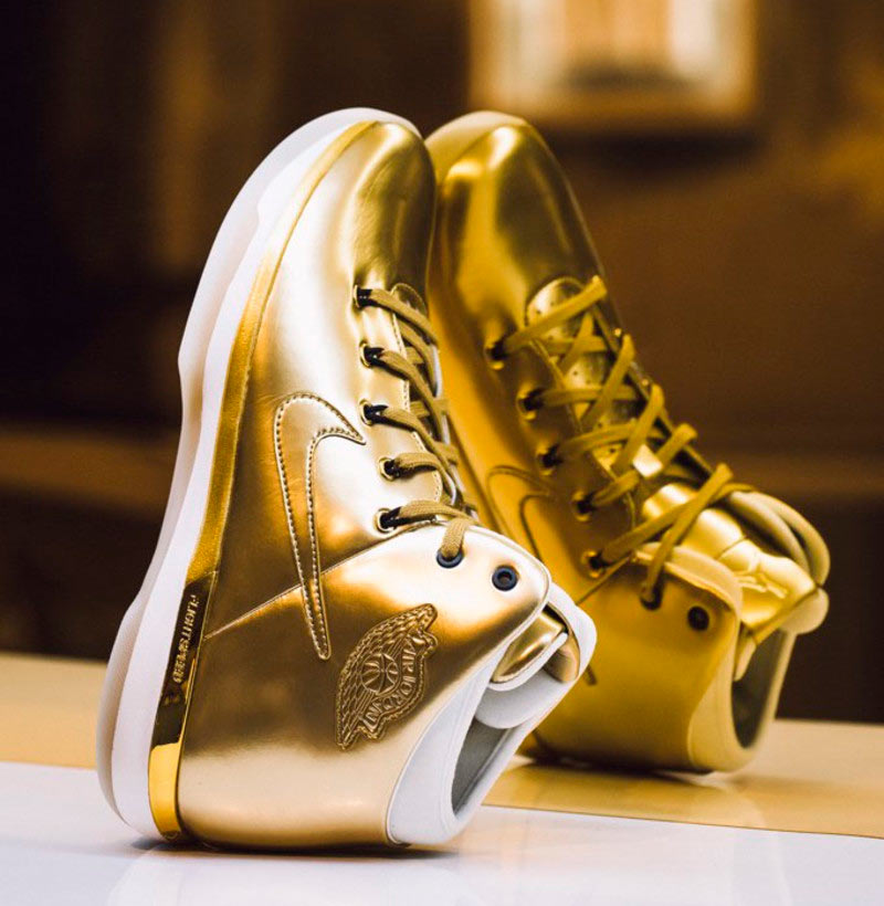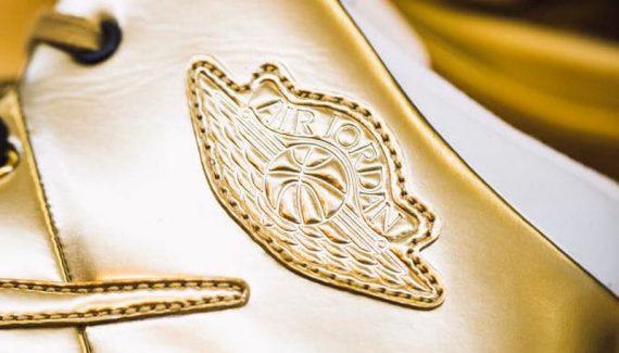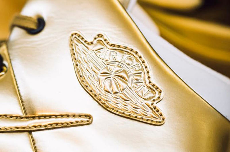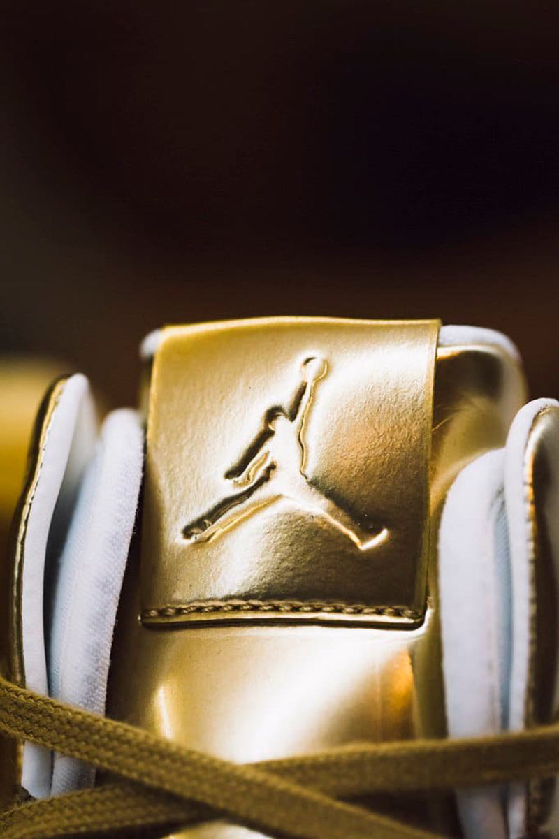 Une finition dorée recouvre toute la tige, y compris la virgule et le logo Air Jordan. La doublure et la semelle sont blanches, et les œillets des lacets sont noirs.