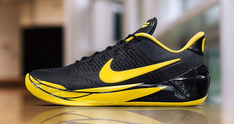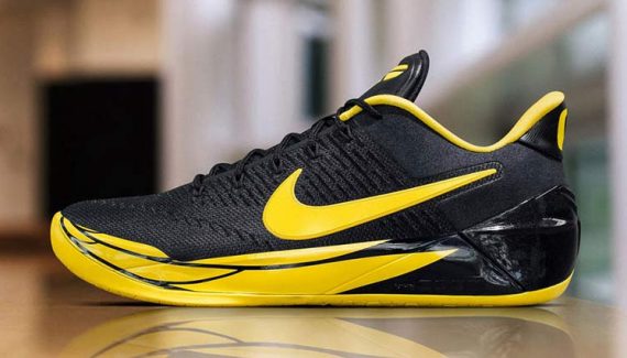 L’aile de l’oiseau fétiche de l’université vient donc se poser sur la semelle de la Kobe A.D, et d’autres touches de jaune viennent habiller la tige noire. Le “O” emblématique des équipes locales est présent sur le talon.