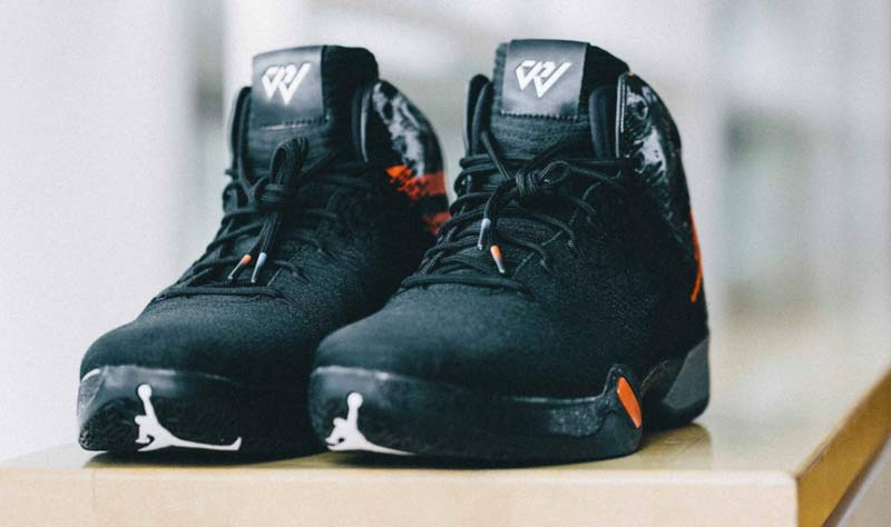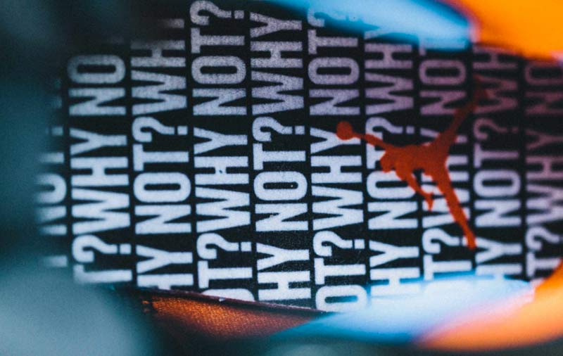 Le résultat, c’est donc la Jordan 30.5 “Why Not ?” Sur une base noire, on retrouve les deux mots imprimés sur les talons du joueur. “Why” à gauche, “Not” à droite. Ils sont réunis à l’intérieur de la chaussure, et le logo du joueur complète la languette.