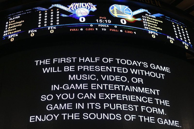 Expérimenter le jeu dans sa forme la plus pure. L’argument marketing est valable, le slogan encore plus engageant : “Profitez du son du match”. De quelle campagne s’agit-il ? D’aucune, juste de la justification des Knicks d’épurer l’atmosphère sonore et visuelle du Madison Square Garden lors de la première mi-temps du match face aux Warriors. L’expérience, que certains mettront sur le compte de la culture hipster pro-minimaliste et expérimentale de Gotham, n’a pas séduit les joueurs. C’est le moins que l’on puisse dire.