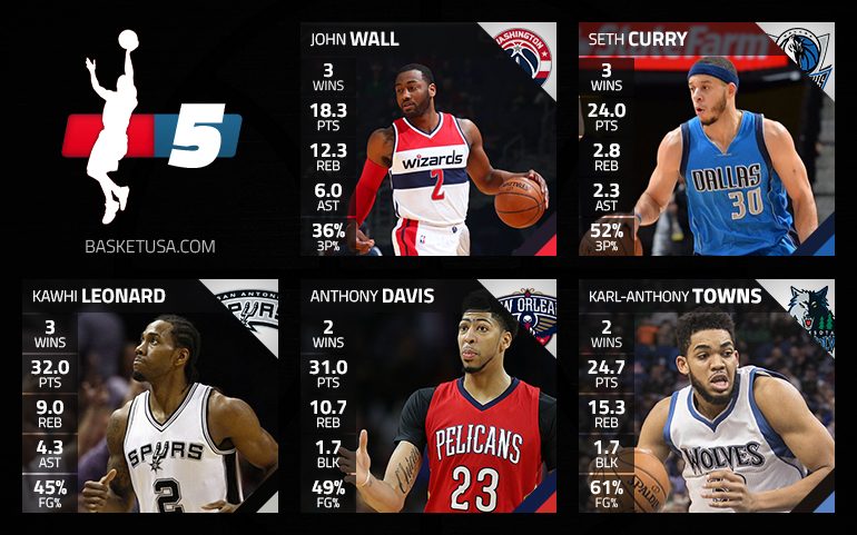 Cette semaine, les plus gros performeurs n’ont pas nécessairement brillé collectivement. Ainsi, Russell Westbrook et Kyrie Irving ont été impressionnants sur le plan statistique mais Cleveland a perdu 2 matches quand le Thunder, lui, s’est incliné 3 fois. C’est donc John Wall qui prend la mène avec son équilibre entre les points et les passes et les victoires des Wizards, notamment celle contre les Warriors.