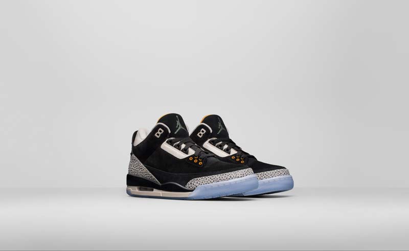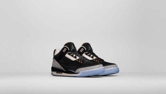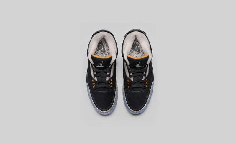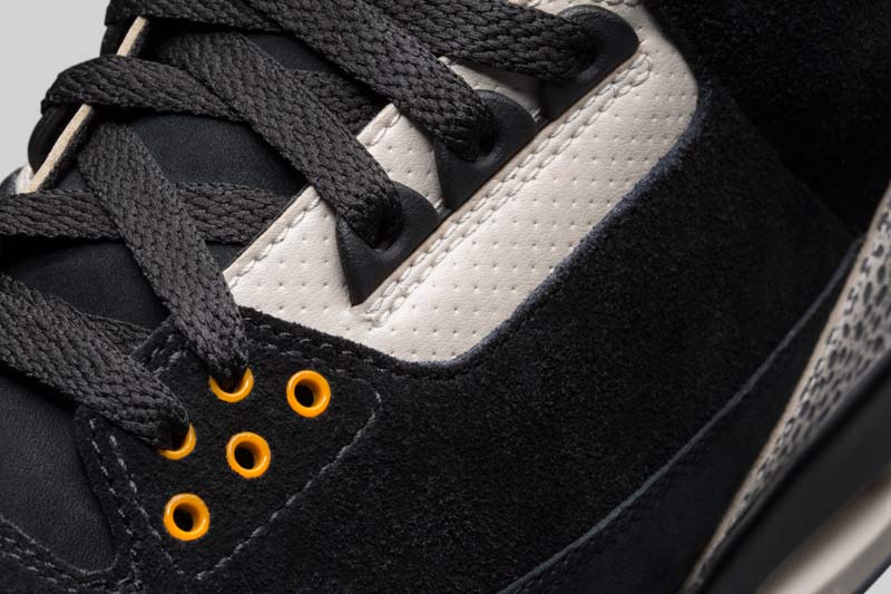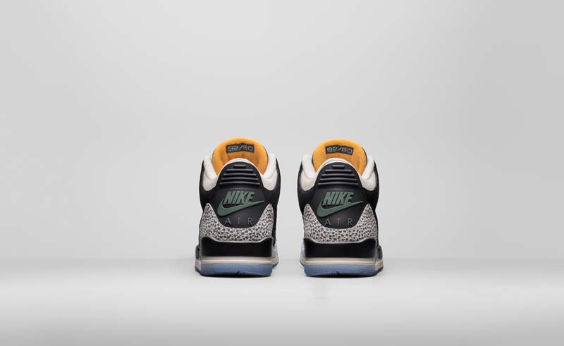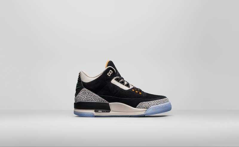 Les ingrédients classiques de la Jordan III sont là, avec l’elephant print, qui vient accentuer une tige noire et blanche en daim. Quelques touches de jaune et une semelle translucide viennent compléter le coloris.