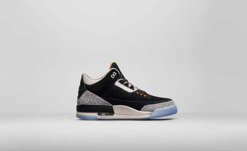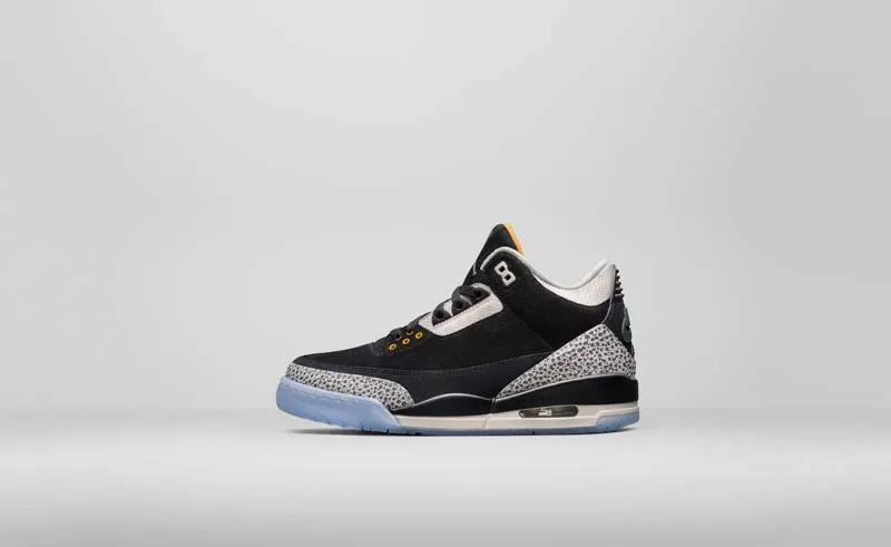 Les ingrédients classiques de la Jordan III sont là, avec l'elephant print, qui vient accentuer une tige noire et blanche en daim. Quelques touches de jaune et une semelle translucide viennent compléter le coloris.