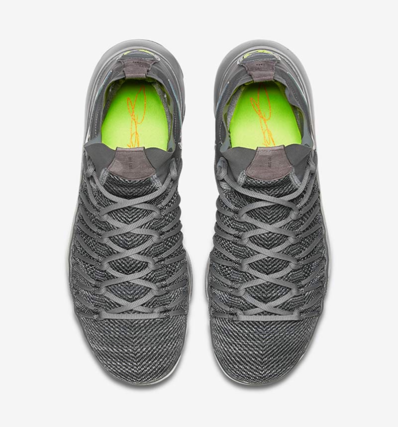 Sur cette évolution de la KD9, le maillage du tissu Flyknit est modifié, les sangles reliées aux lacets sont plus imposantes, et le col a été revu à la hausse. Des modifications qui ne devraient pas fondamentalement changer les performances, mais qui apportent une touche de nouveauté.