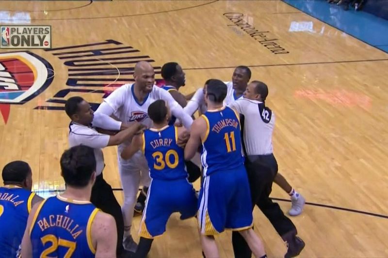 En fin de première mi-temps, sur une situation d’entre-deux, Christon et Curry jouent une petite partition sur la prise de position. Le meneur des Warriors vient gêner le Thunder, et les deux joueurs en viennent aux mains. En quelques instants, tous les joueurs se ruent sur leurs coéquipiers, dans une mêlée ouverte.