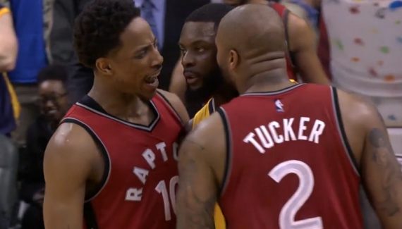 La scène a lieu en toute fin de match. Avec un écart très confortable, Indiana file vers une large victoire alors qu’il reste une poignée de secondes à jouer. Mais alors que son équipe récupère l’ultime rebond, le revenant joue la contre-attaque et s’en va inscrire un layup sans grand intérêt ! Un geste pas du tout apprécié par P.J. Tucker et DeMar DeRozan qui viennent, épaule contre épaule, demander des explications à Lance Stephenson. Et lui brailler dessus.