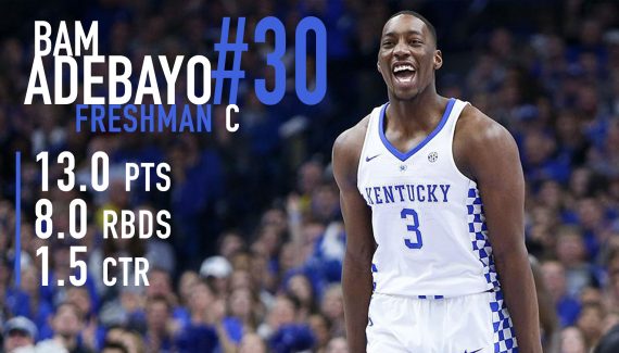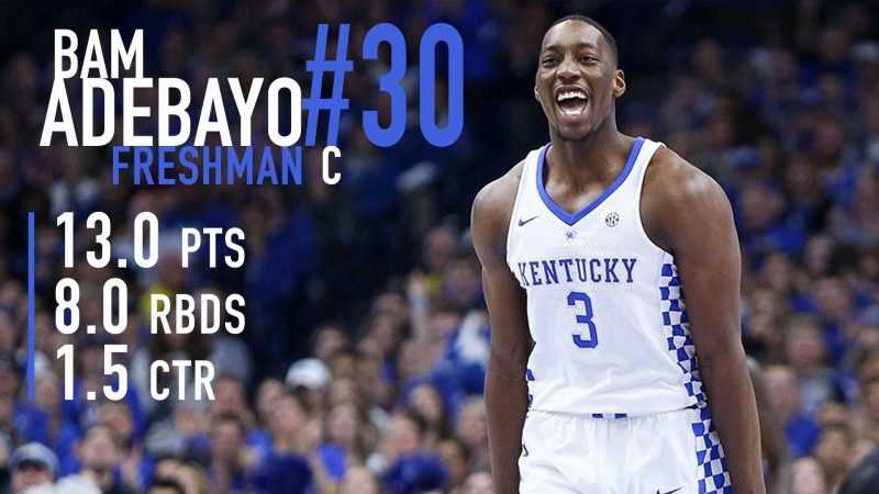 Après Malik Monk et De’Aaron Fox, un autre Wildcat vient d’inscrire son nom sur la liste de la prochaine Draft et il s’agit de Bam Adebayo (19 ans, 2m08). Précieux cette saison à Kentucky avec 13 points et 8 rebonds de moyenne, l’intérieur n’est toutefois pas encore certain de faire le grand saut cette année.