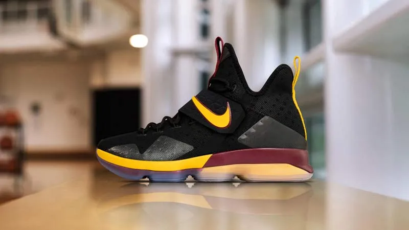 Cette fois, la LeBron 14 a droit à une combinaison noir/jaune/bordeaux, qui devrait parfaitement se marier avec le maillot extérieur des Cavaliers, mais surtout avec la tenue third, totalement jaune.