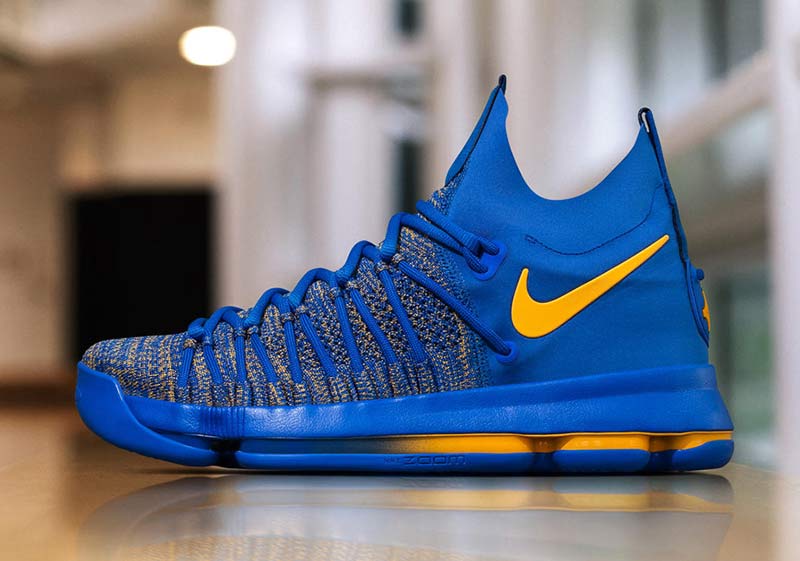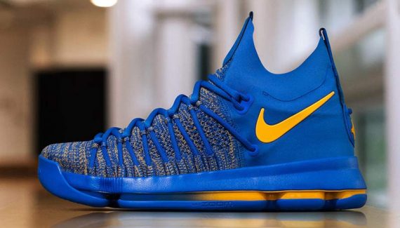 Sans surprise, Kevin Durant aura les pieds en bleu et jaune pour les playoffs. Lundi, Nike a dévoilé un des coloris de la KD9 Elite qui seront utilisés dans les jours à venir.