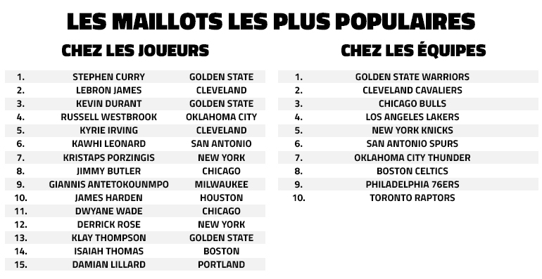Pour la deuxième année consécutive, Stephen Curry et les Warriors sont les grands champions des ventes de maillots. Au niveau des joueurs, le double MVP devance LeBron James et son nouveau coéquipier à Golden State, Kevin Durant.