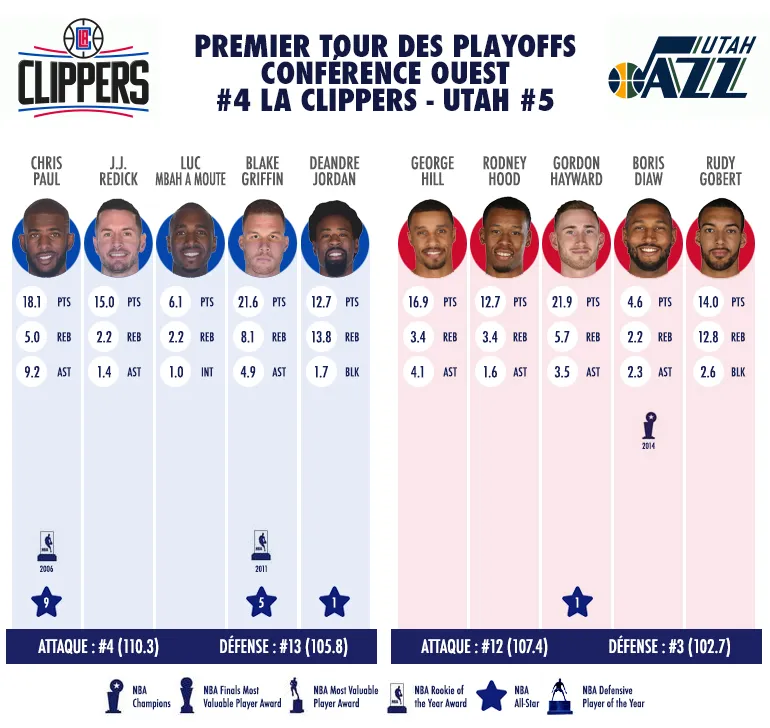 Comme leur classement et leur bilan l'indiquent, la série entre les Clippers et le Jazz s'annonce sans doute comme la plus indécise de ce premier tour à l'Ouest. Si les deux équipes ont terminé la saison régulière avec le même bilan, 51 victoires contre 31 défaites, la bande de Doc Rivers arrivent en playoffs après avoir gagné ses sept derniers matchs. Chris Paul et Blake Griffin, qui ont tous deux manqué 21 matchs cette saison, ont retrouvé leur rythme et leur équipe ressemble à celle qui avait gagné treize de ses quinze premiers matchs.