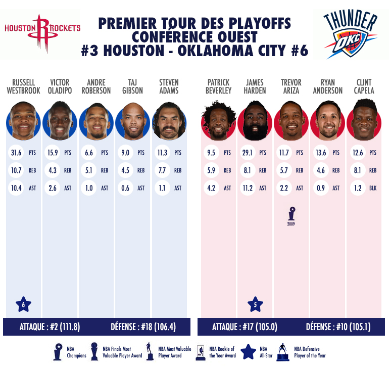 S’il rivalise au niveau des turnovers, Russell Westbrook écrase la concurrence au niveau des points, rebonds et passes avec son triple double de moyenne. Pour ses premiers playoffs sans Kevin Durant, le n°0 voudra sûrement prouver – davantage encore qu’en saison régulière – qu’il est capable de porter le Thunder seul. Un schéma qui, on l’a vu tout au long de l’exercice, est à double tranchant pour son équipe, surtout contre les cadors de la ligue (2-9 face au trio Warriors/Spurs/Rockets). Ceux qui se souviennent de la dernière confrontation entre les deux franchises, se rappellent du gros triple double (39 points, 11 rebonds, 13 passes) d’un Russell Westbrook trop esseulé, face à un James Harden laissant à l’inverse ses partenaires prendre feu derrière l’arc pour une victoire autoritaire 137-125. Un symbole.