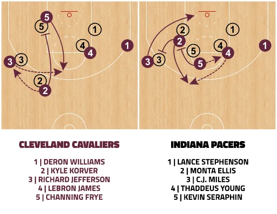 Car l'utilisation de Kyle Korver comme leurre par les Cavaliers met bien en avant les problèmes défensifs d'Indiana, notamment sur les changements. Sur cette action, on peut ainsi voir que C.J. Miles et Paul George ne savent pas quoi faire sur LeBron James, ce qui permet à Kyle Korver de glisser vers le cercle pour un layup extrêmement facile.