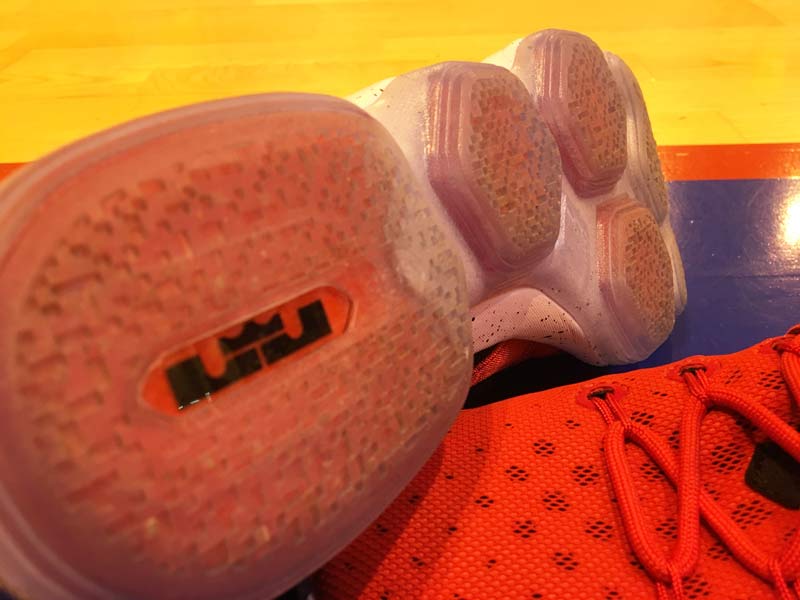 Là encore, la même chose, mais différemment. On retrouve toujours plusieurs poches Zoom Air sous le pied, mais l’amorti est un tout petit peu moins dynamique que sur la LeBron 13. La contrepartie, c’est un gain en terme de court feel. On ne sent toujours pas vraiment directement le parquet, mais il y a des progrès.