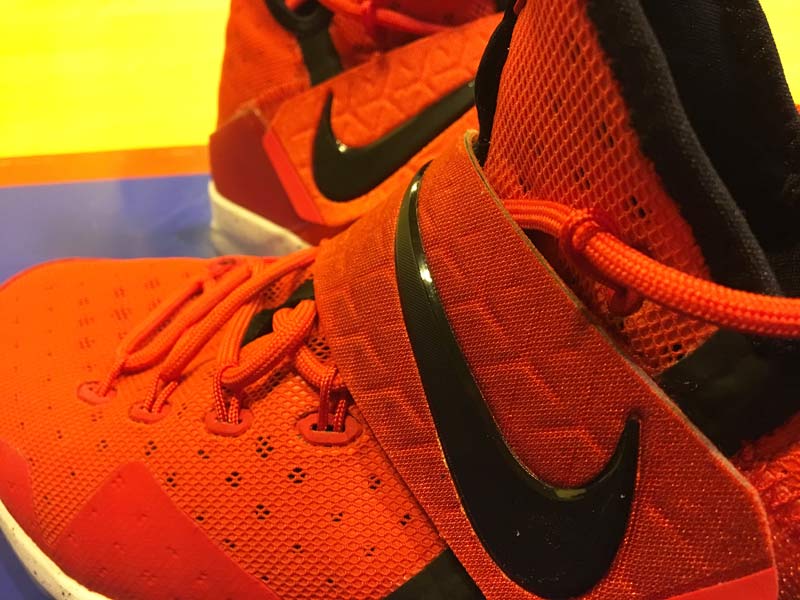 C’est encore une tige en mesh qui accueille le pied, mais un mesh bien plus souple. Nike a d’ailleurs abandonné pour de bon les renforts en plastique “posite.” La chaussure est difficile à enfiler, mais le confort est au rendez-vous, et on a davantage l’impression d’être dans un modèle destiné aux meneurs que dans un des anciens modèles du King. La contrepartie de cette souplesse et de la finesse du mesh, c’est qu’on sent un peu plus les lacets et la sangle. Mais rien de particulièrement gênant à l’utilisation.