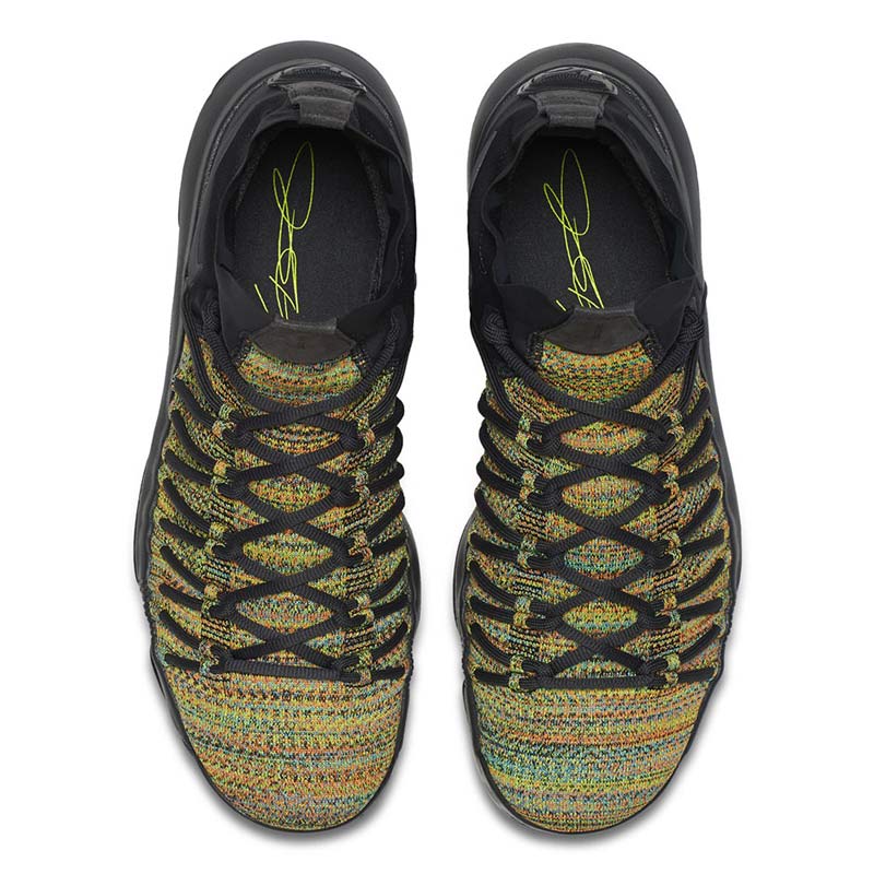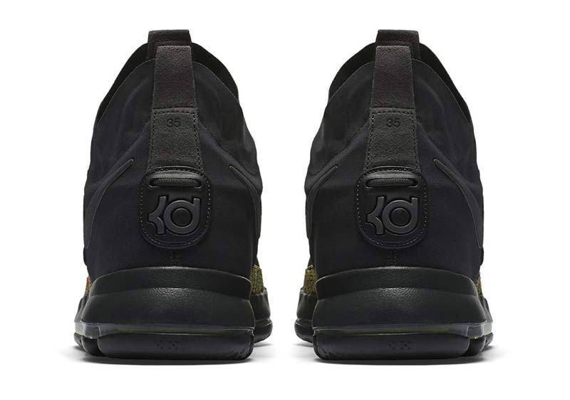 Après la futuriste Bonafide, c’est au tour de la KD9 d’y goûter. Le motif est posé sur une base noire, et maintenu par des lacets de la même couleur.