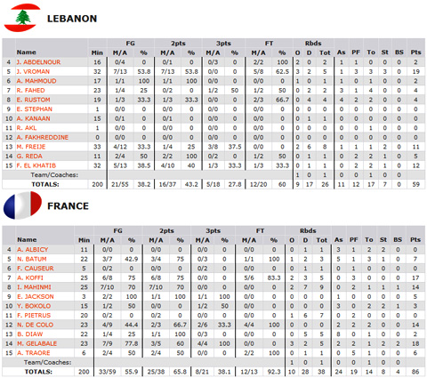 Nouvelle victoire des français face au Liban avec une feuille de stats qui traduit la domination des Bleus au rebond (38 rebonds à 26) et à la création (24 passes dont 8 pour le seul Boris Diaw…). On notera le gros match d’Alain Koffi (17 points, record en équipe de France) et de Ian Mahinmi (14 points, 9 rebonds) mais aussi l’adresse exceptionnelle de Mickael Gelabale (18 points à 7/9, dont 4/4 à 3 points).