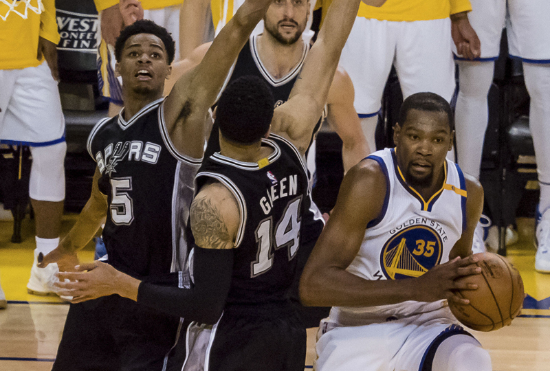 Kevin Durant attaque Dejounte Murray, le ballon s’envole, l’ailier des Warriors le récupère puis le glisse dans le cercle. Golden State repasse devant et c’est l’interrogation un peu partout. N’y a-t-il pas marcher sur cette action ? LaMarcus Aldridge esquisse d’ailleurs un geste, tandis que Manu Ginobili va discuter avec un arbitre.