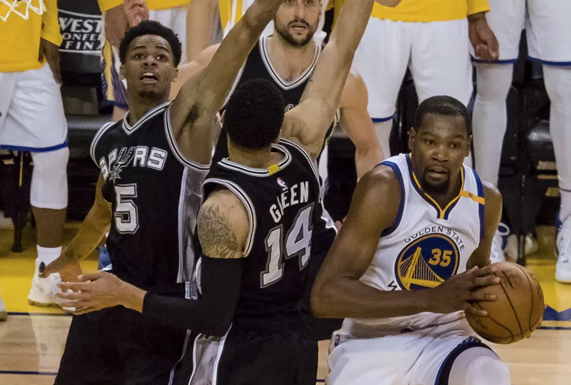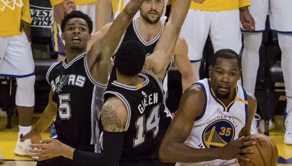 Kevin Durant attaque Dejounte Murray, le ballon s'envole, l'ailier des Warriors le récupère puis le glisse dans le cercle. Golden State repasse devant et c'est l'interrogation un peu partout. N'y a-t-il pas marcher sur cette action ? LaMarcus Aldridge esquisse d'ailleurs un geste, tandis que Manu Ginobili va discuter avec un arbitre.