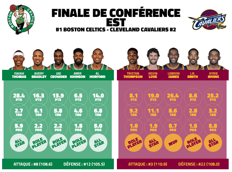 Comme à l’Ouest, la logique sportive est respectée, et la finale de conférence Est oppose donc les deux meilleures équipes de la saison régulière de ce côté du pays : Boston et Cleveland. Les deux formations ont connu des fortunes diverses en playoffs. Les Celtics ont bataillé ferme face aux Bulls et aux Wizards, et donc disputé 13 matches, quand les Cavs ont écrasé les Pacers et les Raptors en huit petites rencontres.
