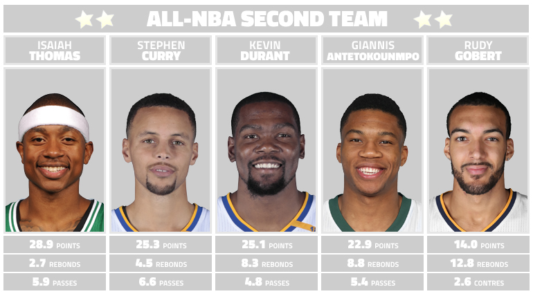 Aux portes du meilleur cinq de l’année, on retrouve Rudy Gobert dans le deuxième cinq, et il est bien entouré puisqu’on retrouve les deux anciens MVP et désormais coéquipiers : Stephen Curry et Kevin Durant. A leurs côtés, deux All-Stars et révélations de la saison : Isaiah Thomas, devenu l’un des meilleurs scoreurs de la NBA ; Giannis Antetokounmpo, All-Star et favori pour le titre de Most Improved Player. Comme pour la First All-NBA Team, il n’y a pas eu trop de débat sur ces cinq noms, et seuls Damian Lillard et John Wall auraient pu bousculer ce quintet.