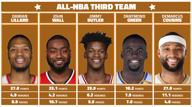 Damian Lillard et John Wall sont victimes de l’incroyable niveau des meneurs de jeu en NBA. Ils sont dans le 3e cinq, mais ils n’ont pas grand chose à envier à ceux qui les précèdent. Mais voilà, Westbrook et Thomas ont réussi des saisons exceptionnelles, et Curry, même moins flamboyant, a réalisé une grande saison. Aux côtés des meneurs de Portland et de Washington, beaucoup de noms ont été proposés. A la mène, certains ont cité Kyrie Irving et Chris Paul, et DeMar DeRozan a aussi reçu des voix. Il est le seul véritable deuxième arrière et il mériterait sans doute une place dans l’un des cinq de l’année.