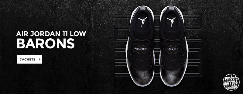 Commandez chez B4B la Air Jordan XI Low Barons dont l’empeigne en nubuck noir et en cuir verni présentant des notes argentées est inspirée des couleurs de l’équipe de baseball des Barons.