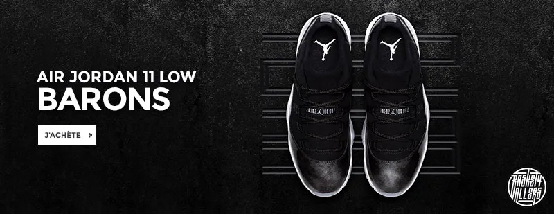 Commandez chez B4B la Air Jordan XI Low Barons dont l'empeigne en nubuck noir et en cuir verni présentant des notes argentées est inspirée des couleurs de l'équipe de baseball des Barons.