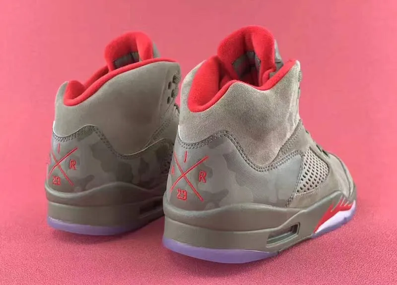 Un peu moins d'un mois plus tard, le 2 septembre, c'est dans une teinte “Camo” que la Jordan 5 sera de nouveau disponible. Le coloris rappelle ce que la marque avait fait sur sa collaboration avec Supreme, dans une déclinaison un peu plus épurée. Ici, la tige est en daim. Quelques éléments réfléchissants sont placés sur la languette et le talon.