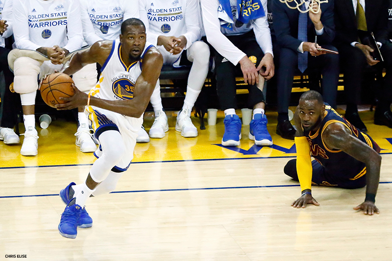 Alors que Cleveland semble sur le point de faire basculer la dynamique du match, Kevin Durant prend ses responsabilités pour débloquer la situation. Il envoie Richard Jefferson au tapis et plante un tir à mi-distance. On ne le sait pas encore mais c’est le début d’une réponse cinglante de Golden State.