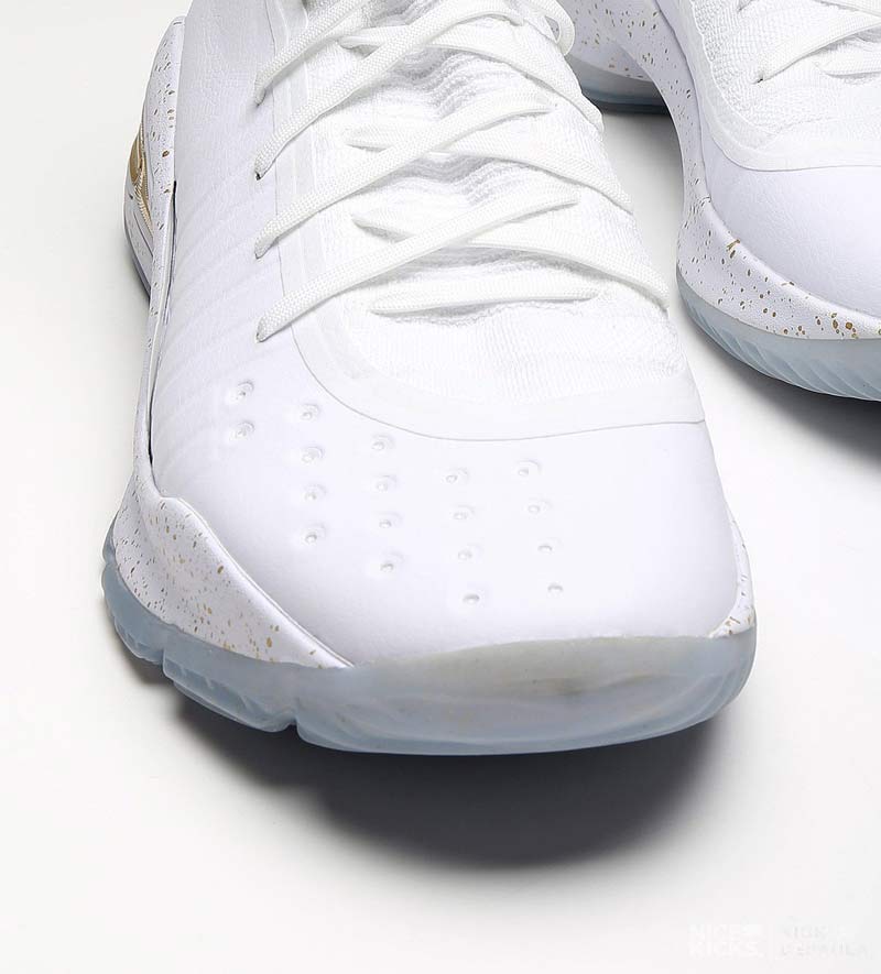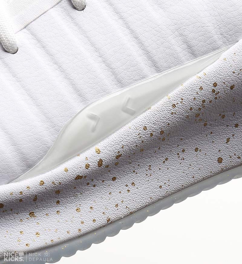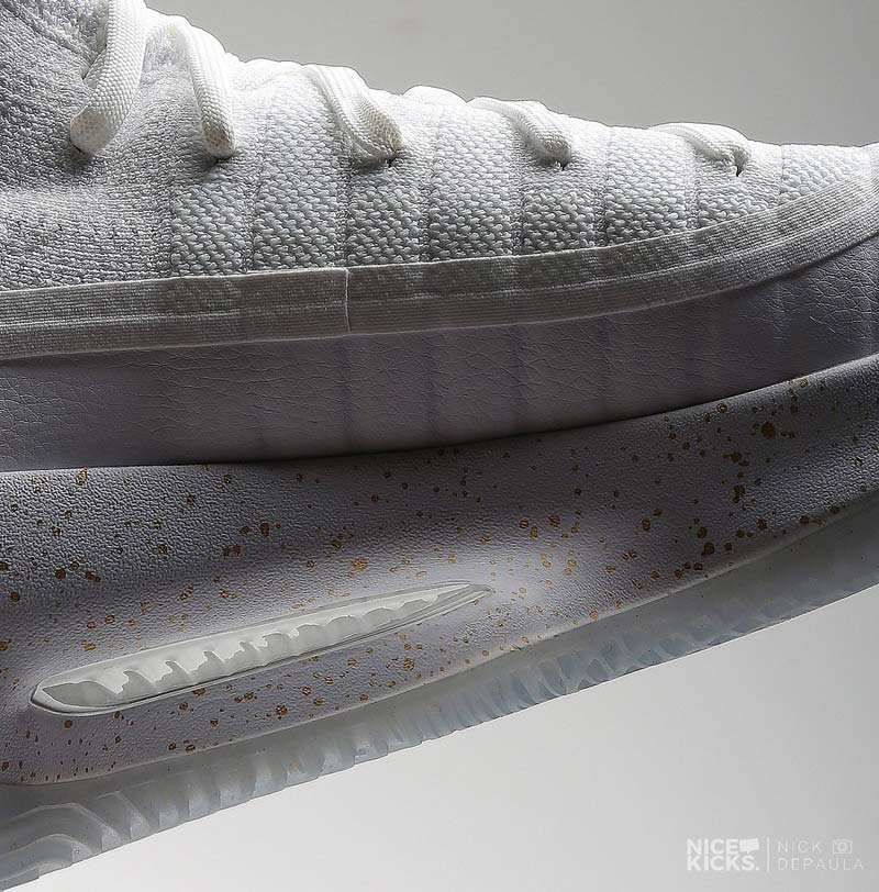 Mais Nick DePaula, journaliste pour Nice Kicks et Yahoo, a pu approcher la nouvelle chaussure du meneur des Warriors. L’occasion de prendre des clichés très détaillés de ce modèle qui se détache assez nettement de la Curry 3. Le col et le coup de pied sont composés d’un matériau tissé. Un peu plus bas, un cuir synthétique semble apporter de la rigidité pour bloquer le pied.